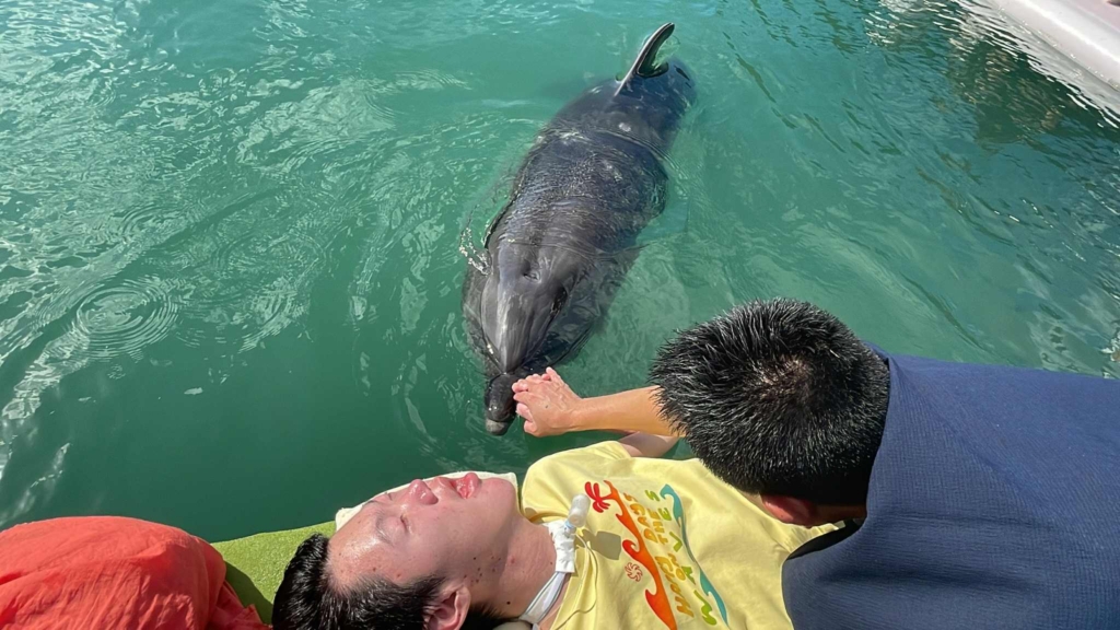 息子さんが20歳のとき、長年の夢だったイルカとの触れ合いが実現!イルカが息子さんの様子を察して自ら近寄ってきてくれた瞬間は、忘れられない思い出となりました。